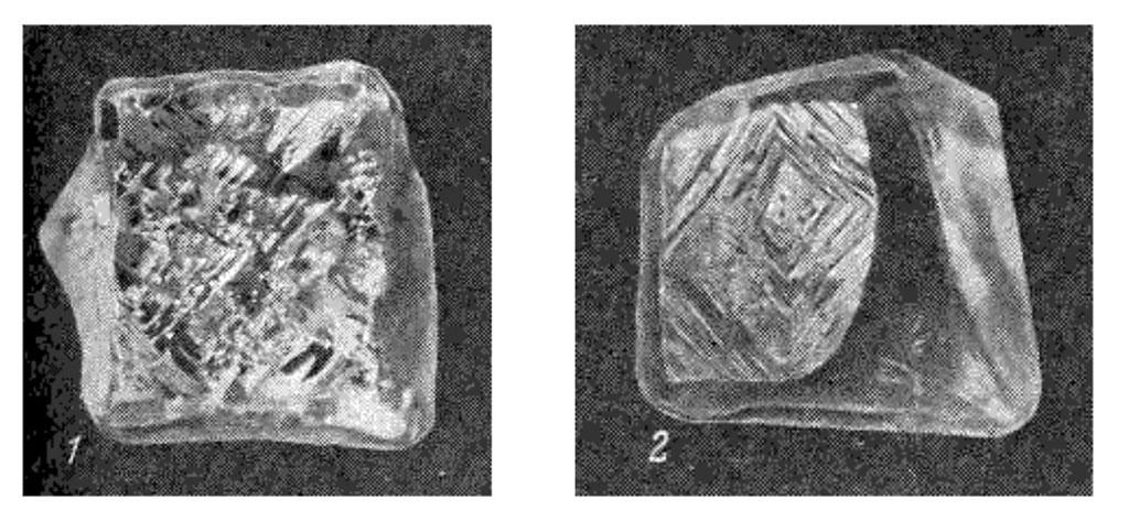 Рис. 6. Кристаллы алмаза разновидности II. 1-2 – кубические кристаллы с округлыми ребрами, Приленская область (Орлов, 1973)