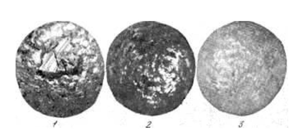 Рис. 10. Сферолиты алмаза (балласы, разновидность VI) 1 – сферолит с одним крупным лучом- сектором, выделяющимся на поверхности, Урал, Красновишерский район; 2-4 – черный и темно-серые тонколучистые сферолиты, Бразилия