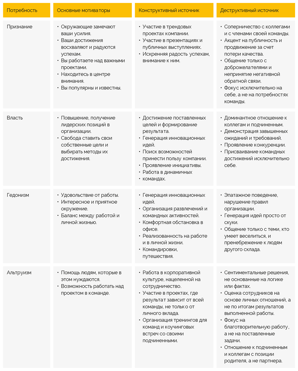 Как реализовать потребность в признании конструктивно? Повышать уровень профессионализма, достигать поставленных целей, выступать на публике, приносить окружающим пользу. Однако, к сожалению, некоторые люди пытаются повысить свою ценность через принижение и обесценивание других, запугивание, грубость и сплетни. Вы могли встречать таких властных руководителей, которые выстраивают свой авторитет на силе. Также наверняка вы знакомы с людьми, которые постоянно подшучивают над вами или окружающими, упражняясь в сарказме. Если вы замечали похожее поведение за собой, постарайтесь все же использовать конструктивные методы, а не разрушать свою и чужую карьеру. Возможно, ваши шутки и смешат коллег, но руководитель может относиться к такому поведению иначе.