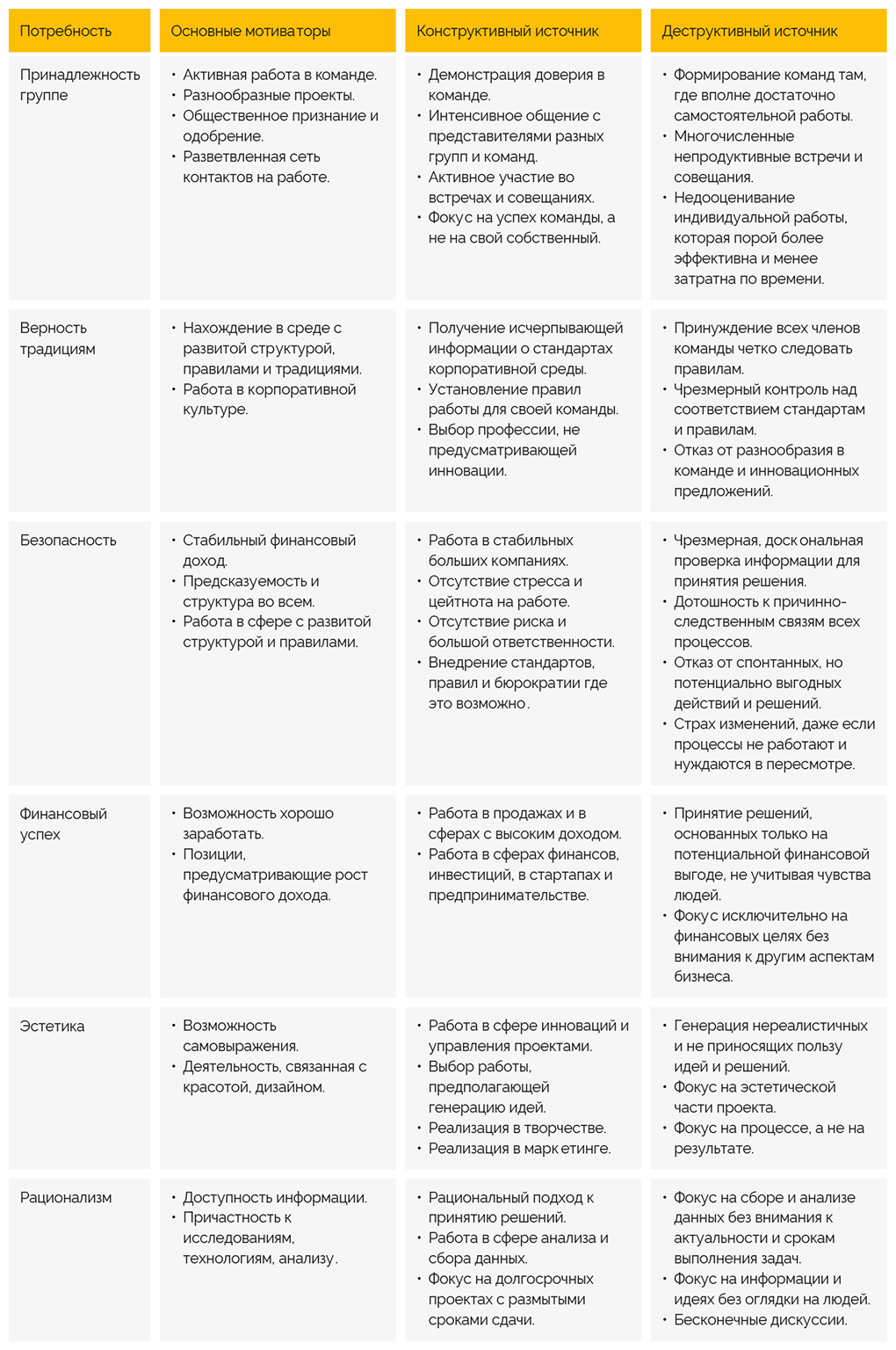 Таблица 1. Источники удовлетворения потребностей, соответствующих основным лидерским ценностям