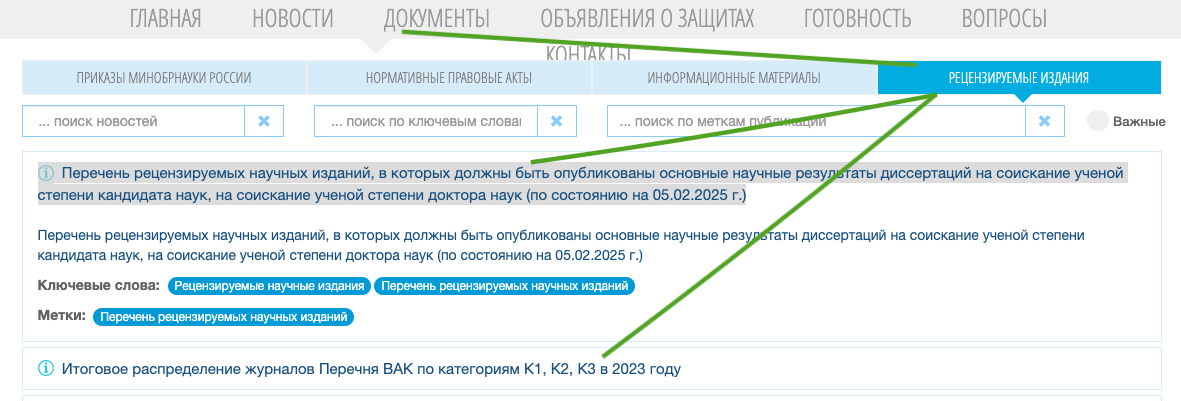 Списки ВАКовских журналов по категориям К1, К2 и К3 утверждаются раз в несколько лет; их важно смотреть, если ваш ВУЗ или диссертационный предъявляет особые требования к категориям журналов, в которых вы публикуетесь.