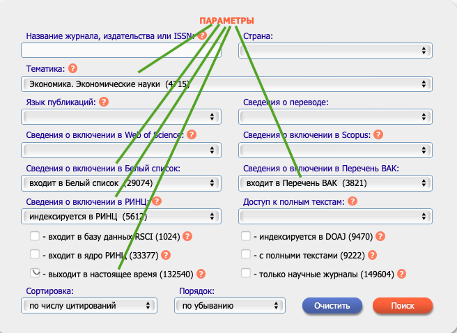 Обратите внимание, что журнал может входить в список ВАК, но не входить в «Белый список». На сайте eLIBRARY.ru в разделе «Каталог журналов» выделяйте те параметры для поиска журналов, которые нужны именно вам: