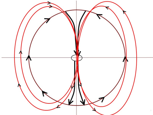 Здесь всеобщая ошибка – перейти в другое пространство-время в данном случае возможно. Но! Туда будет вынесена материя с внутреннего отверстия северного полюса. А на Южном мы попадем в ту же систему, но сами будем иные. Переформатированные. Смотрите, как идут вертикальные силовые линии. Я для простоты беру только один кокон, где линии поля идут снизу – с юга вверх, к северу.