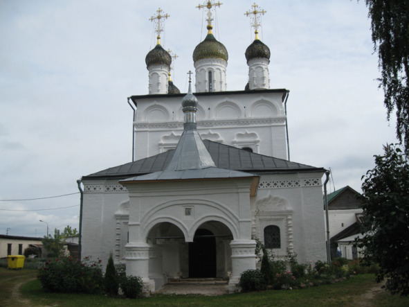 Первой возвели каменную церковь – Собор Сретения Владимирской иконы Божьей Матери. Главная его достопримечательность – купола, выполненные из глазурованного лемеха с золотым отливом. Нигде больше в центральной России не найти подобной красоты. Ближайшим аналогом можно признать выполненную по сходной технологии облицовку куполов мавзолея Гур-Эмир в Самарканде.