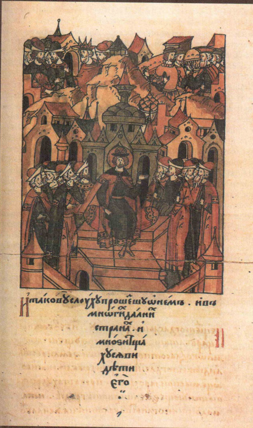 В центре князь, изображенный в тронном зале, на торжественной церемонии. А в левом верхнем углу – он же, но уже в походно-полевых условиях. Поэтому и головной убор другой.
