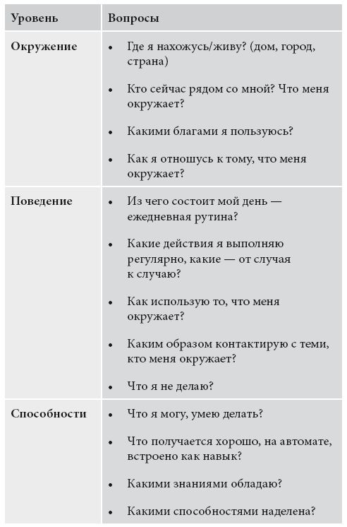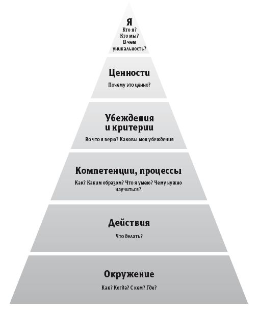 Обратите внимание на ее начальные уровни – окружение, поведение, способности. Там нам чаще всего хочется изменений – проявленное и видимое, то, с чем соприкасаемся каждый день. Поднимаясь выше по пирамиде, мы охватываем все стороны нашего существования – до бытия и его смысла. На каждом уровне – спрашивайте и внимательно слушайте себя.