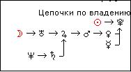 № 6. По цепочке владения. Построение цепочек по владению очень просто, оно составляется по знаку управителю положения каждой планеты. Например: Солнце в Скорпионе – связь Солнце – Плутон; Плутон в Скорпионе – связь Плутон – Плутон; Меркурий в Скорпионе – связь Меркурий-Плутон; Венера в Скорпионе – связь Венера-Плутон. Это выглядит примерно так: