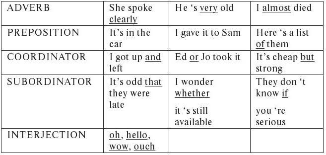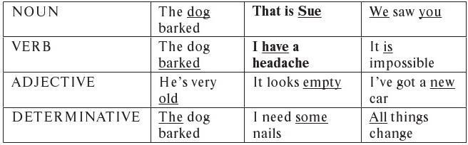 The two largest and most important categories are the noun and the verb, the two that we have already introduced. The most basic kind of clause contains at least one noun and one verb. The first six categories in list can function as the head of corresponding phrases (noun phrase, verb phrase, adjective phrase, etc.). The other three can’t [1].