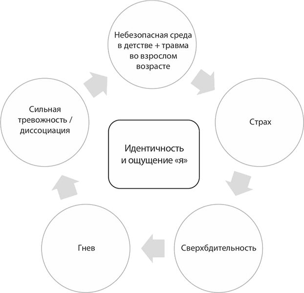 Окружение значительно влияет на идентичность и ощущение «я». Небезопасная среда в детстве и дополнительный травмирующий опыт во взрослом возрасте могут вызвать страх или сверхбдительность – повышенное внимание к происходящему вокруг и к возможным угрозам. Природа травмы и бремя симптомов кПТСР порождают гнев, что объяснимо и случается часто. Гнев и страх приводят к тревожности, а впоследствии к диссоциации (нарушению целостности восприятия, в том числе своего «я»), что запускает или отягощает цикл травмы.