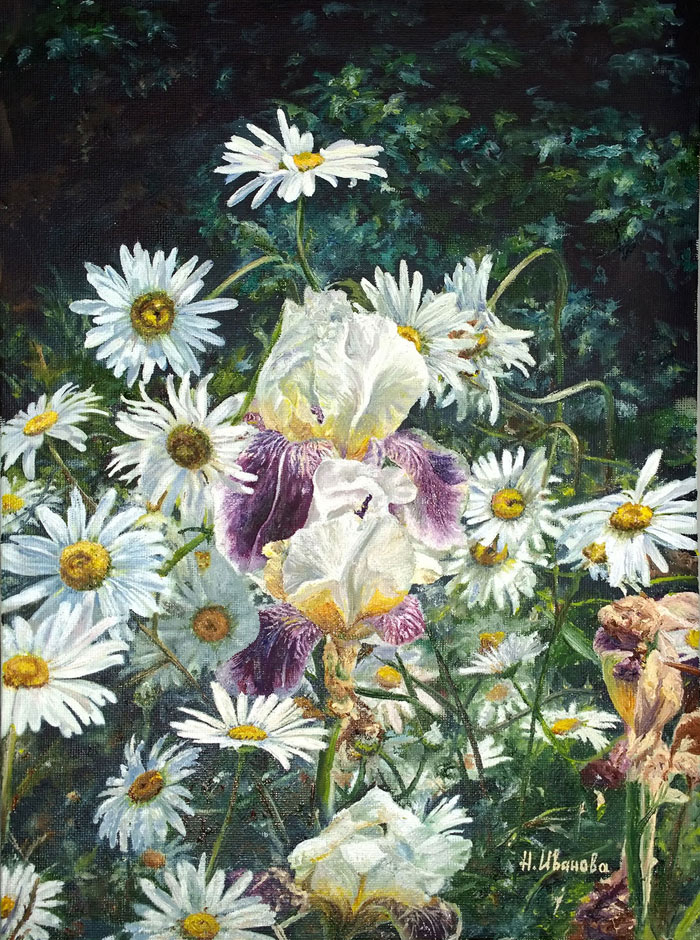 "Ирисы и ромашки" масло / холст размеры 35 х 25 см. 2014 год