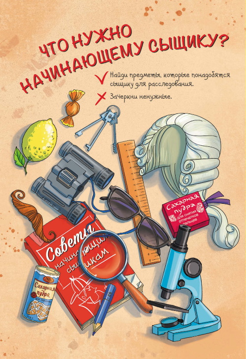 Дог Шмитт достал из кармана карандаш, лупу, лимон, отмычку, книгу «Советы начинающим сыщикам», линейку, бинокль, микроскоп, сахарную пудру для снятия отпечатков пальцев, сахарную пудру для приготовления глазури, тёмные очки и парик.