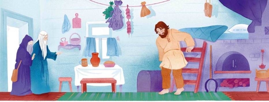 Однажды, когда Илья, как обычно, лежал на печи, в дом вошли волхвы[1] и попросили подать им воды. Илья ответил, что не может ходить. Но старцы как будто бы не услышали его слов и повторили свою просьбу во второй раз.