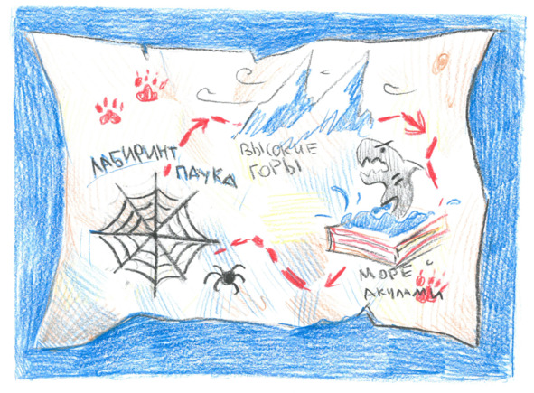 – Это море с акулами, надо пройти и не упасть в зубастую пасть, – подвинув к нему карту квеста, начала объяснять Маша. – Это пещера ужаса, – показала она на дупло, – надо руку опустить внутрь и на ощупь узнать предмет.