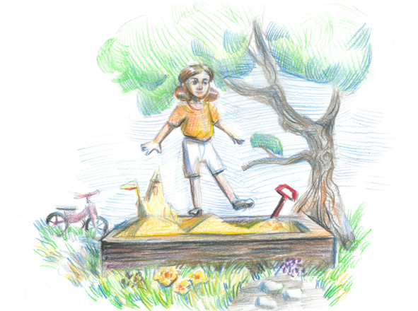 В субботу Маша вышла на прогулку. Пескарик весело носился по двору. Ему все было интересно, он всюду совал свой черный нос – хотел обнюхать каждый куст и каждый камень. Других детей на детской площадке не было. Присев на скамейку, Маша выводила узоры палочкой на земле.