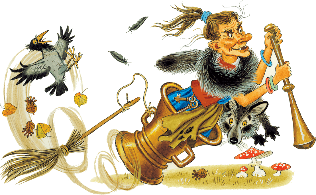 Полезла Яга под клеть, выкатила из-под клети медную ступу, взяла толкач и помело. Залезла в ступу и покатила – только гул да треск. Яга в ступе скачет, толкачом погоняет, помелом свой след заметает.