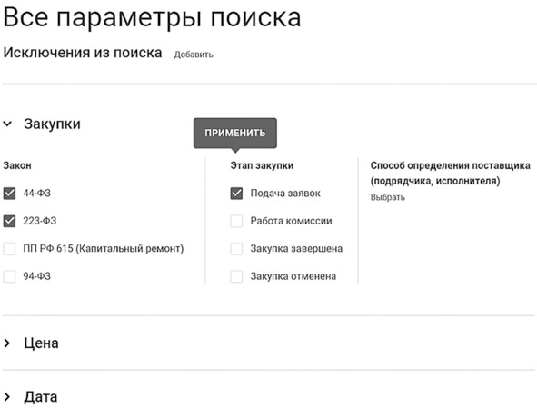 Одним из таких вариантов является поиск закупок через ЕИС. Для этого необходимо зайти на главную страницу https://zakupki.gov.ru/ и перейти в раздел «Все параметры поиска». Далее следует выставить требуемые параметры, насколько это позволяет система. Помимо требуемых параметров в поисковой строке можно указать слова, связанные с предметом вашего поиска, или же искать процедуры по ОКПД 2 (это будет чуть сложнее, но более правильно).