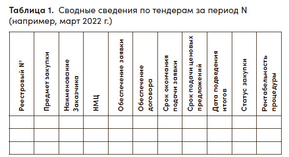 Таблица может быть краткой или подробной. А может, она и вовсе не понадобится. Однако по опыту практической работы с госзакупками могу предложить достаточно удобный вариант (табл. 1). Легче вести таблицу помесячно, чтоб в ней не накапливалось