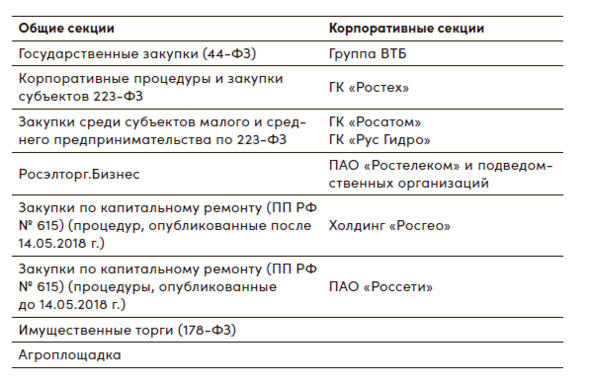 Несмотря на то, что теперь регистрация на федеральных ЭТП проходит автоматически, желательно каждый раз обращать внимание, на какой площадке проходит процедура. Сложностей с подачей заявки по 44-ФЗ, скорее всего, не возникнет, но по 223-ФЗ существует достаточно большое количество секций, требующих отдельной аккредитации. Например, на рис. 2.2 мы видим количество секций при входе на «Росэлторг».