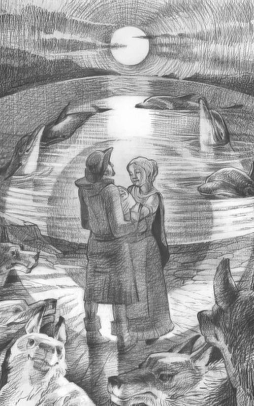 Мама, нежно прижимая девочку к груди, зашла в воду, Отец, поклонившись Вожаку Волков, пригласил его к воде и, наступив на кромку воды, поклонился Дельфину Отцу. Теперь на кромке появились два полукруга: тёмный из воды образовали дельфины и светлый из песка сделали волки, образуя вместе прекрасный круг, а в середине круга стояли люди с девочкой на руках. С восторгом смотрело заходящее Солнце на Круг Живого Света Планеты, и вот уже последние лучи стали прощаться с Планетой, как вдруг подул холодный ветер, прилетела чёрная туча, заплакав скорбным дождём. Все присутствующие, образовав круг, повернулись к Солнцу, в их глазах был печальный вопрос, и Солнце вспыхнуло алым костром, обдав сердце каждого огнём. Замерли птицы в небе, трава в лесу, и Мама, стоя в круге, крепко прижала малышку к себе. На секунду затихла Природа в ожидании ответа, но Солнце с грустью нежно улыбнулось последним лучом и ушло за горизонт, оставив всем присутствующим Веру, Надежду и Любовь.