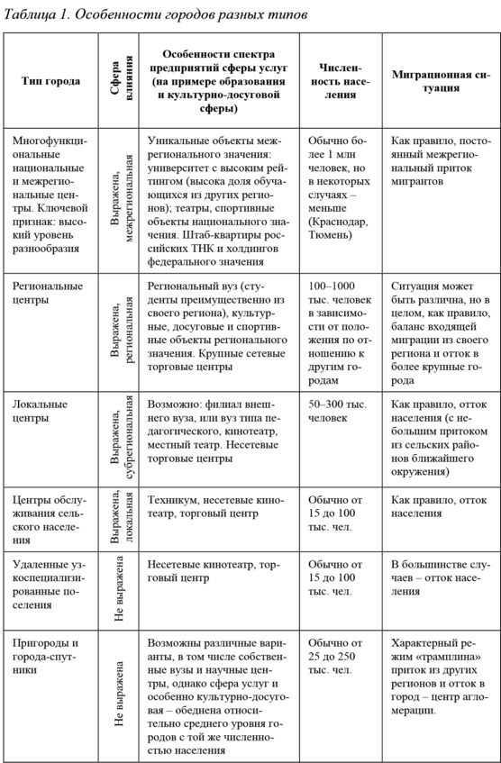 Первые четыре типа городов включают относительно разнообразный спектр видов экономической деятельности в целом, имеют развитую сферу услуг, досуга и культуры (и чем более разнообразна эта сфера и более уникальные услуги доступны, тем выше ранг города). Пример, соответственно, иерархии: Екатеринбург, Саратов, Елец, Россошь. Каждый из четырех данных типов имеет выраженную сферу влияния, различающуюся размерами. Центры обслуживания сельского населения, в отличие от остальных центров, не оказывают существенного влияния на соседние города, а лишь на окружающую сельскую территорию, вследствие небольшого размера. Пятый тип определяется узостью специализации – к этой категории относятся монопрофильные города, а также поселения, не имеющие соответствующего статуса, однако по особенностям своего развития схожие с монопрофильными. Такие города, как правило, не имеют выраженной сферы влияния, или она очень сужена (несколько ближайших сельских поселений). Пример: Губаха, Усинск. Редукция сферы влияния связана, в первую очередь, с узостью спектра предоставляемых услуг (хотя также и с конкуренцией других городов, имеющих более широкий спектр видов деятельности). Шестая группа городов также не имеет своей выраженной сферы влияния, но в данном случае причина другая: они расположены в пределах крупных городских агломераций, и даже обладая объективно довольно широким спектром видов деятельности и развитой городской средой, оказываются под «угнетающим» влиянием близлежащего крупного города, вытягивающего миграционные потоки, предприятия сферы услуг и др. Пример: Мытищи, Люберцы.
