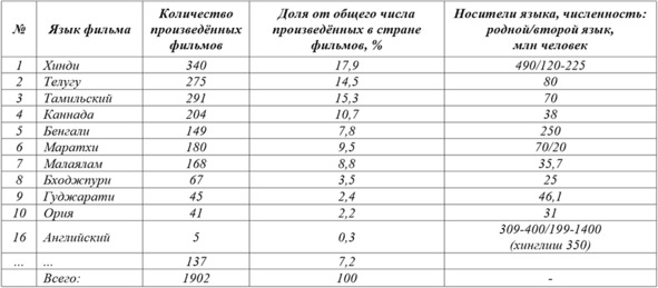 Интересно, что многоязычие Индии отчасти объясняет феномен «Болливуда» – весомого количества фильмов, производимых индийским кинематографом (название феномена составлено из слов «Бомбей», это старое название города Мумбаи, и «Голливуд») – см. таблицу 1. А главными языками, на которых говорят в фильмах – хинди, телугу, тамильский, каннада, бенгали, маратхи и малаялам. Для примера, в рассмотренный период 2015—2016 годов на английском языке было выпущено лишь пять фильмов из 1902.