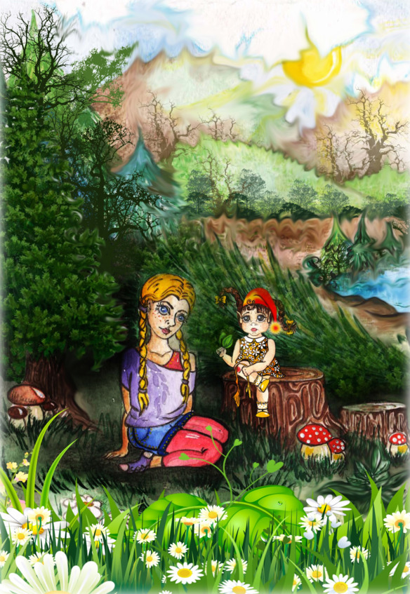 Этот голосок звучал прямо у корней дерева. Маша заглянула и у большой норы увидела маленькую девочку в ромашковом сарафанчике, со смешными, торчащими в разные стороны, тёмными косичками и жёлтыми бантами. Ростом она была с годовалого малыша, но разговаривала хорошо, хоть и странно! Малышка не была похожа на кого-то из детей посёлка. Она сидела на пеньке, привязывала лист подорожника к разбитой коленке с помощью пояска от своего испачканного платья. На голове её был смешной красный колпачок с золотистым бубенчиком.