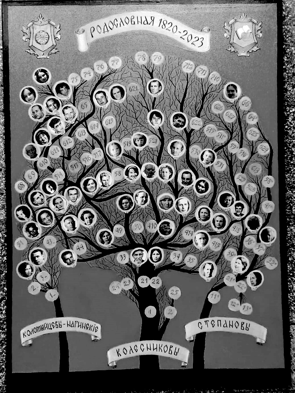 Родословную нашей семьи я разработала в трёх видах: иерархическая схема поколений с указанием имён и дат жизни; полная родословная по компьютерной программе со всеми связями и подробными данными; дизайнерский вариант в виде дерева, который здесь представлен.