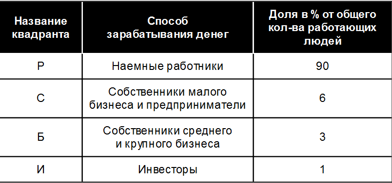 Все, кто читал книги Роберта Кийосаки, знают, что работающие люди обычно создают свои доходы четырьмя основными способами. По его классификации люди делятся на 2 неравные группы: люди с мышлением наемного работника (их большинство, свыше 90 % от всех работающих людей) – квадрант «Р», и люди с мышлением работодателя (предприниматели, владельцы малых, средних и крупных бизнесов, инвесторы) – квадранты «С», «Б» и «И». Всех работающих людей он поместил в так называемый «квадрант денежного потока».