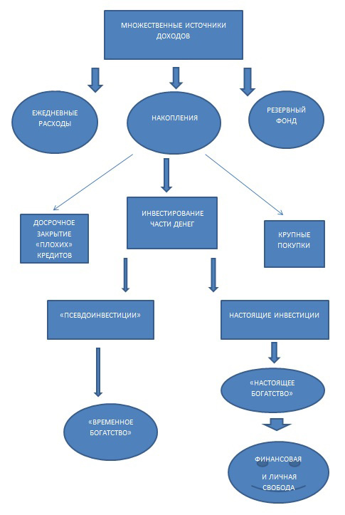 Схема создания богатства или капитала людьми включает в себя несколько этапов. Сначала они работают над повышением доходов и созданием множественных источников доходов. Они стараются на всем экономить и тратить не все доходы, а только их часть. У этих людей обязательно имеется резервный фонд (на случай потери доходов или при возникновении форс-мажорных обстоятельств). Они стараются досрочно закрыть все свои «плохие» кредиты, после чего начинают делать накопления. Накопления они пускают на приобретение товаров длительного пользования (жилья, автомобилей, мебели, отдыха и др.), а часть денег (не менее 20 %) непременно направляют в «инвестиции». Некоторые из их вложений, к сожалению, приводят к частичной потере денег («псевдоинвестиции»), а часть, наоборот, сохраняет и приумножает их капитал («настоящие инвестиции»). Именно такие «настоящие инвестиции» создают им богатство, генерируют пассивные доходы, а вместе с ними дарят им финансовую и личную свободу. Это то, к чему стремятся все инвесторы.