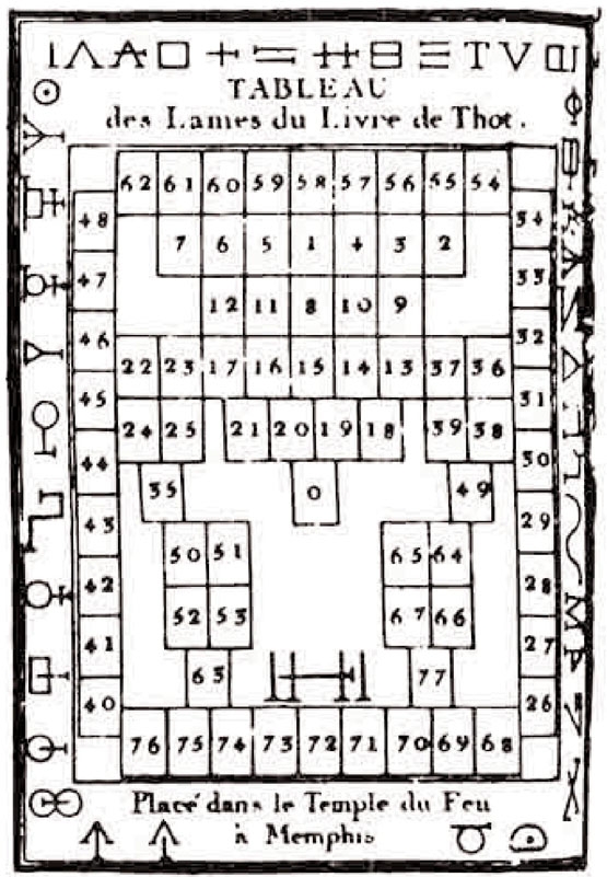 Рисунок из книги Эттейллы, изображающий план храма Тота в Мемфисе и карту расположения 78 таблиц Таро