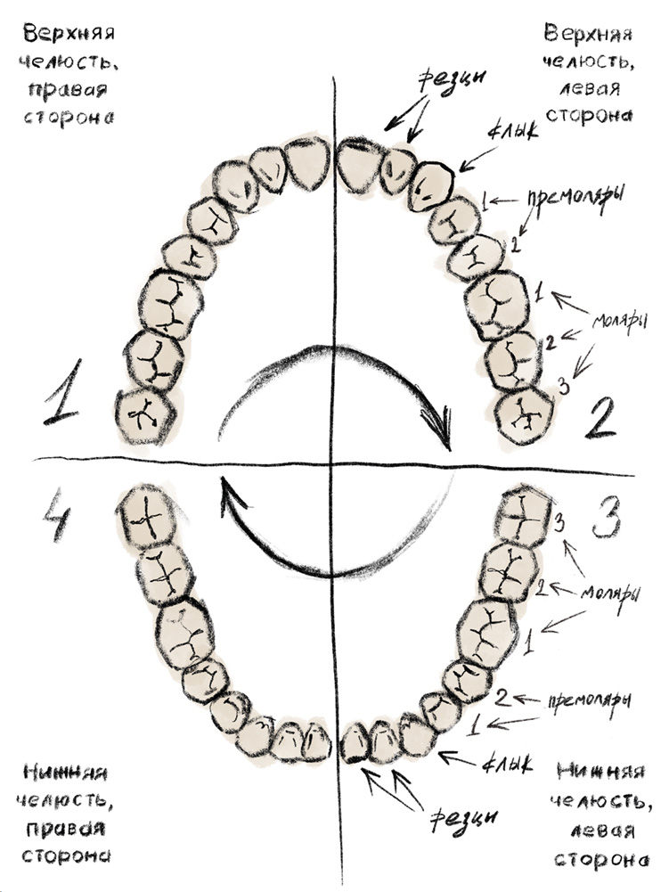 Чтобы вам было проще и вы наконец поняли, что имел в виду стоматолог, говоря «правая верхняя восьмерка» и «левая нижняя тройка», я расскажу вам про квадранты.