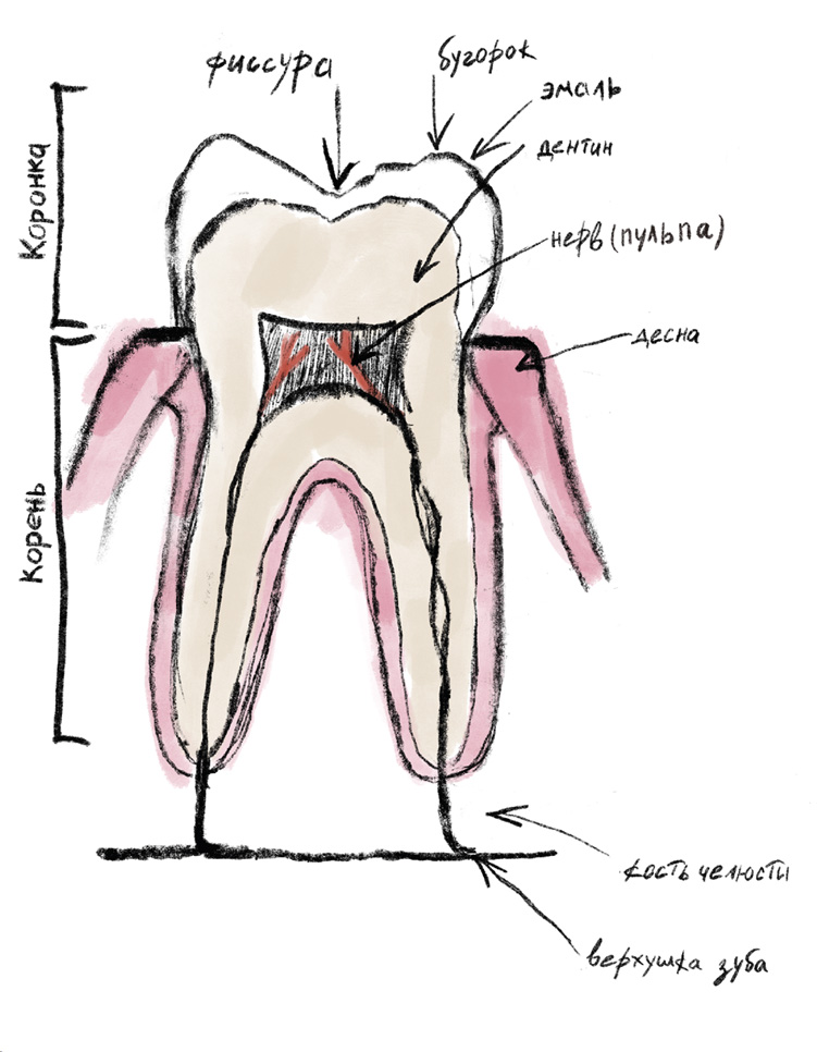 Если вы откроете рот и посмотрите в зеркало (я знаю, вы уже это сделали), то увидите лишь одну треть всего зуба. Это называется коронковая часть, или коронка.