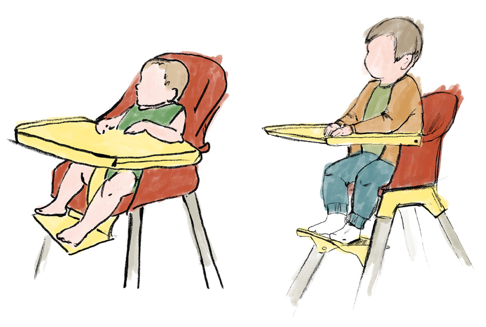 Обращайте внимание на положение ребенка, когда он ест. Обычно к моменту прикорма малыш уже умеет сидеть. Поэтому прежде, чем дать ему еду, маленького человека нужно усадить за столик и проследить, что его ножки крепко стоят на подножке, соприкасаясь с ней всеми ступнями целиком, и образовывают прямой угол в коленях. Это важно как для формирования зубочелюстной системы, так и для будущей осанки.