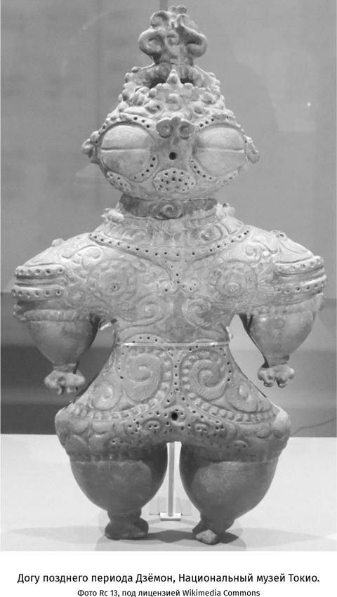Одни из самых поразительных предметов эпохи Дзёмон – каменные и керамические фигурки, называемые догу. С особым искусством их делали в северо-восточной части страны на протяжении среднего и позднего периода Дзёмон. Догу с ярко выраженными антропоморфными чертами[3] отличаются выпученными глазами – иногда их называют «глазами в виде кофейных зерен» или «глазами в защитных очках», поскольку по форме они похожи на традиционные снежные очки северных народов. Одни фигурки изображают беременных женщин с выдающейся грудью, а некоторые, судя по всему, были намеренно разбиты. Археологи предполагают, что такие фигурки могли использоваться знахарями в ритуалах родовспоможения или лечения ран и болезней.