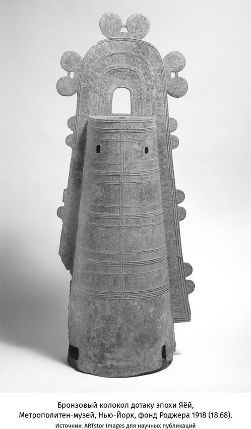 Эстетическую и социальную сферы жизни обогатила также металлургия. Японцы начали использовать железо и бронзу примерно в 300 году до н. э. Оба металла долгое время обрабатывались в Китае и Корее, и переселенцы принесли эти технологии в Японию. Все железо, медь и олово, использовавшиеся в эту эпоху, были импортированы с Азиатского континента. Железо, обработанное на наковальне, в основном использовалось в быту для изготовления инструментов и оружия. Из бронзы – сплава меди и олова – отливали ритуальные предметы, являвшиеся символами власти, например мечи, зеркала, колокола дотаку. Первоначально колокольчики копировали континентальные образцы, но по мере развития кузнечного ремесла в Японии колокольчики увеличились в размере и усложнились по форме. Поздние модели богато украшены, а их стенки настолько тонки, что они, возможно, утратили музыкальные функции[4] и служили символами вассальной зависимости от некой политической власти. В пользу этой теории говорит тот факт, что колокола, отлитые из одной литейной формы, находили при раскопках на удаленных друг от друга местах.
