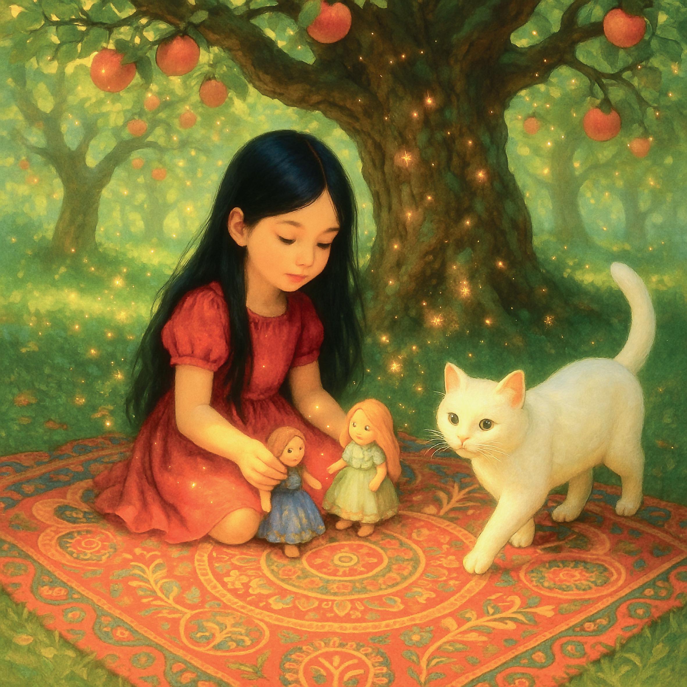 Ноза взяла пару кукол и устроилась под большой и старой яблоней. Она усадила их перед собой и представила, как будто куклы – это ее подруги, и они вместе отправляются в волшебную страну.