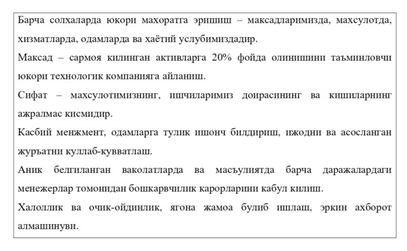 4) ишлаб чикириш тизими унсурларининг ижобий тарзда уз-узини бошкариши учун зарурий шароитни яратиш;