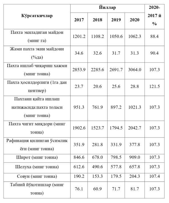 2-жадвалда Ўзбекистон Республикасида 2017—2020 йилларда пахта ишлаб чиқариш ва уни қайта ишлашни иқтисодий кўрсаткичлари таҳлил этилган. Пахта экин майдони 88.4%га, жами пахта экин майдонининг фоиздаги ҳисоби 90.4фоизни ташкил этган. Пахта ишлаб чиқариш хажми 107.3%ни, пахта ҳосилдорлиги 121.5%ни, пахта толасининг хажми 107.3%ни, пахта чигит миқдори 107.3%ни, рафинация қилинган ўсимлик ёғи ҳам 107.3%га, широт ва шелуха ҳам 107.3%га, совун ва табиий йўқотишлар ҳам 107.3%ни ташкил этган.