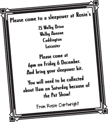 That’s why Rosie wouldn’t let us sleepover at hers, because everywhere was in a mess, especially her bedroom. We kept telling her it didn’t matter and in the end she changed her mind. She gave us these neat invitations. Adam did them for her on his computer. I’ve still got mine. Do you want to see it?