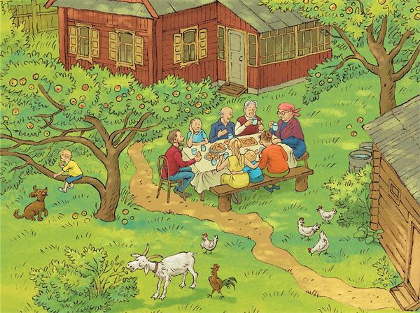 Поездка к дедушке – не только удовольствие, но и работа. У каждого в хозяйстве свои обязанности. Дед носит из колодца воду, топит баню, копает огород. Бабушка хлопочет по дому – убирается, готовит.