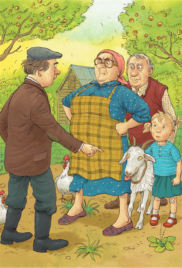 Председатель, обнаружив обглоданные кусты, прямиком пришёл ссориться с бабушкой и дедушкой. Дедушка сразу перед ним извинился. Но председатель всё не мог успокоиться и требовал, чтобы козу забили. Чем вывел из себя бабушку.