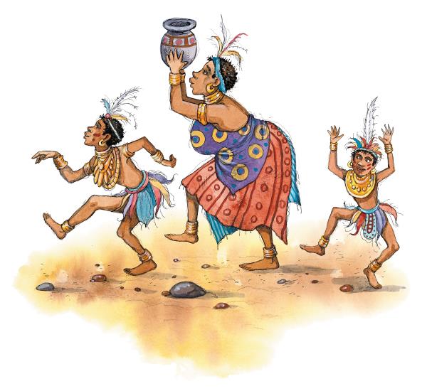 – Теперь мой черёд колдовать! – услыхал он знакомый голос антилопы. Одним грациозным движением антилопа сломала прутик… Кри-кранх! – перед антилопой появился мешок, доверху набитый перьями всех цветов радуги и яркими затейливыми украшениями. И снова – не успел Аджао получше рассмотреть содержимое мешка, как антилопа бросила прутик на землю – и мешок со всем его добром исчез. Словно и не бывало его!