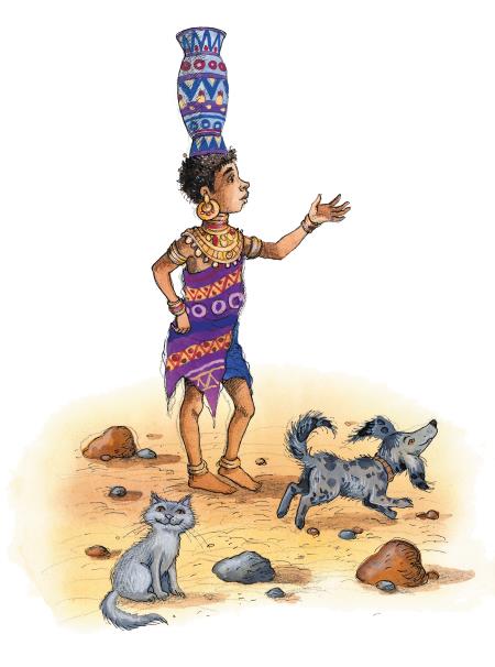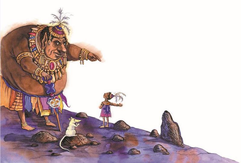 Пока мальчик спал, бабушка испекла ему на дорогу пирожков со сладким бататом, наполнила колодезной водой калебасу – сосуд из высушенной тыквы. И с первым стрекотанием кузнечика мальчик, закинув на плечо котомку, отправился в путь. Идёт день, идёт два. И видит, впереди река, такая широкая, что не хватит верёвки, чтобы на другом берегу дерево заарканить. Как быть?..