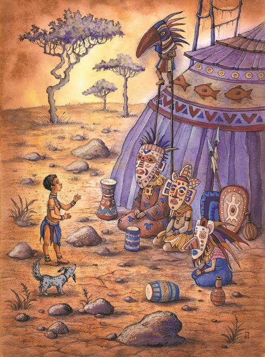Проснулся мальчик и пошёл по самой прямой дороге. Идёт день, идёт два. И дорога привела его в тот край, где обитают души предков. Вот уже и селение вдали показалось… Но тут из кустов выползла змея – ядовитая чёрная мамба. Она широко открыла пасть, показав мальчику свой страшный раздвоенный язык. Мальчик хотел убежать, но вовремя вспомнил наказ мамы. Не отрывая глаз от змеиного жала, он замер на месте – и змея, шипя, уползла прочь.