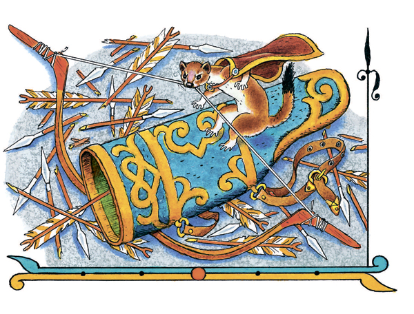 Тут Вольга слетел вниз воробушком, обернулся горностаюшкой. У него тело узкое, зубы острые. Побежал горностай по царскому двору, пробрался в глубокие подвалы царские. Там у луков тугих тетиву пооткусывал, у стрел древки перегрыз, сабли повыщербил, пáлицы дугой согнул.