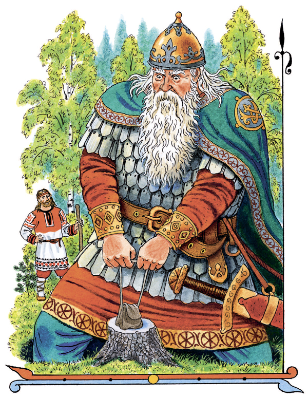 Зашёл Святогор в кузницу и видит: стоит у наковальни седой старичок, одной рукой меха раздувает, другой молотом по наковальне бьёт, а на наковальне-то не видно ничего…
