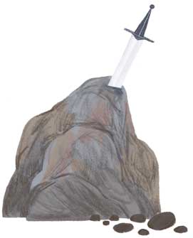 Артур со всех ног бросился к трактиру. По дороге он пробегал мимо церковного двора и заметил меч, воткнутый в камень. Не читая написанные на камне слова, он вытащил меч и поспешил с ним обратно на турнир.