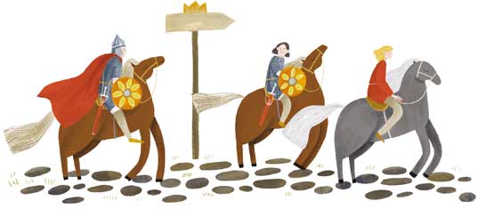 Три принца пообещали сделать то, о чём просил отец, и на следующий день они вместе отправились в путь, взволнованные предстоящими поисками. Всё утро ехали они, пока не приехали на место, где дорога расходилась в три разные стороны.