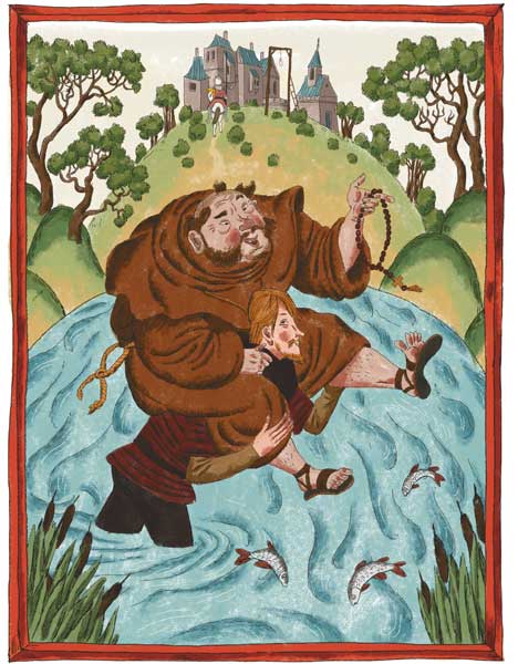 Шея монаха была так толста и крепка, что парню показалось, будто он уселся верхом на узловатую ветвь дуба. Свой лук и колчан он поднял над головой, чтобы не измочить их в воде. Дубинкой он помахивал в воздухе перед самым носом смиренного отшельника.