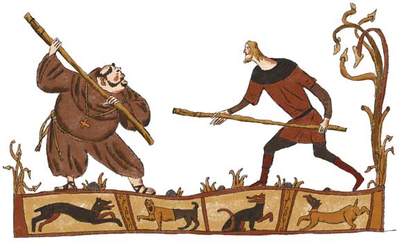 При этих словах парень в пунцовой куртке остановился и опустил дубину. А святой отец, не дожидаясь приглашения, нагнулся и вытащил из-под куста отличную палицу, также окованную железом и сверкавшую от долгого употребления. Мокрый плащ его упал на землю, а дубина взлетела в воздух и принялась выписывать хитрые восьмёрки над его головой. Лесной бродяга звонко рассмеялся.